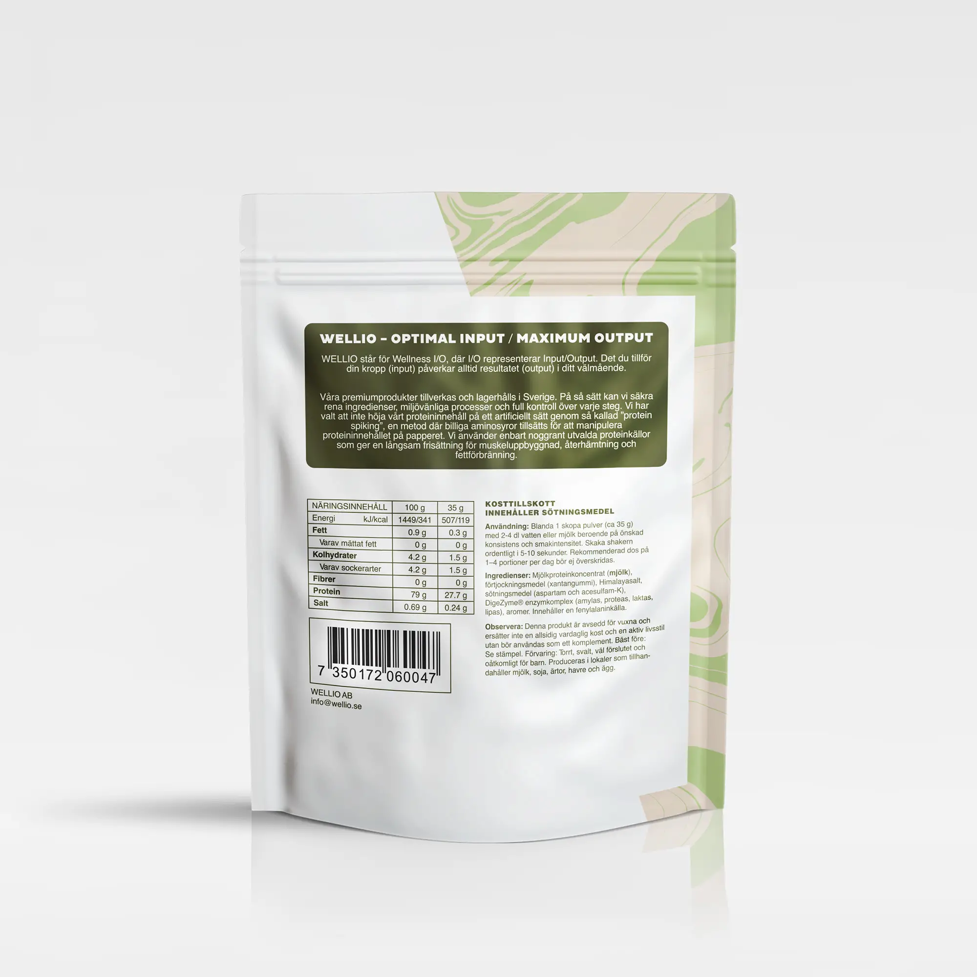 Blanda 1 skopa pulver (ca 35g) med 2-4 dl vatten eller mjölk i en shaker. Mängden vätska är avgörande för att hitta önskad konsistens och smakintensitet. Skaka ordentligt i 5-10 sekunder.